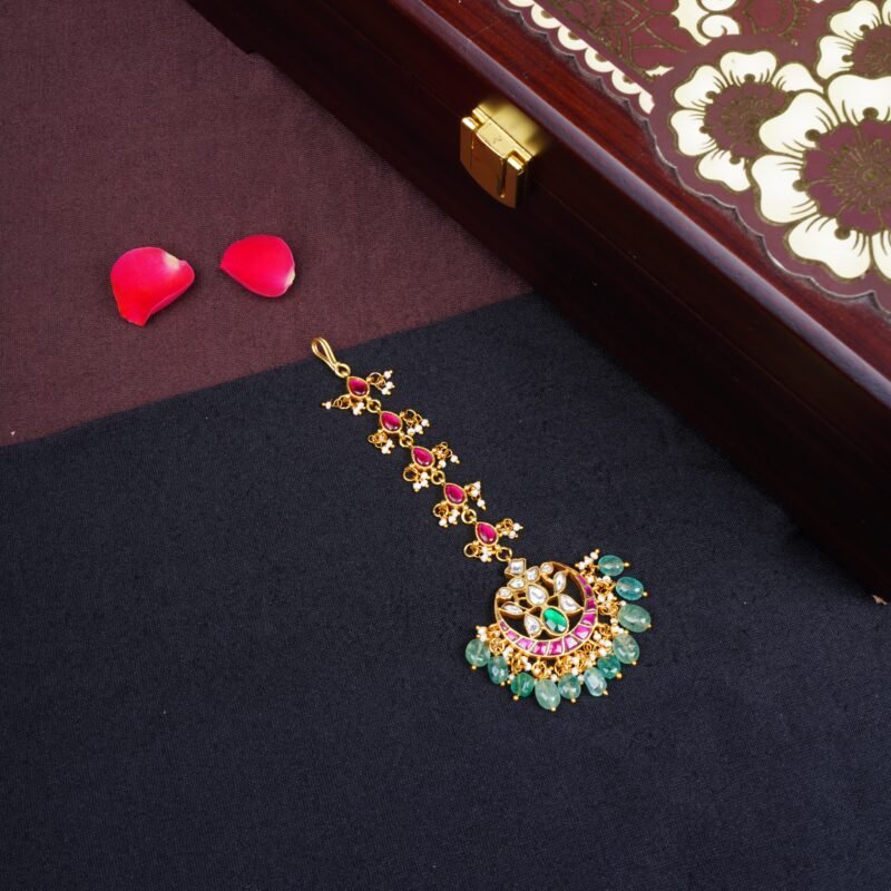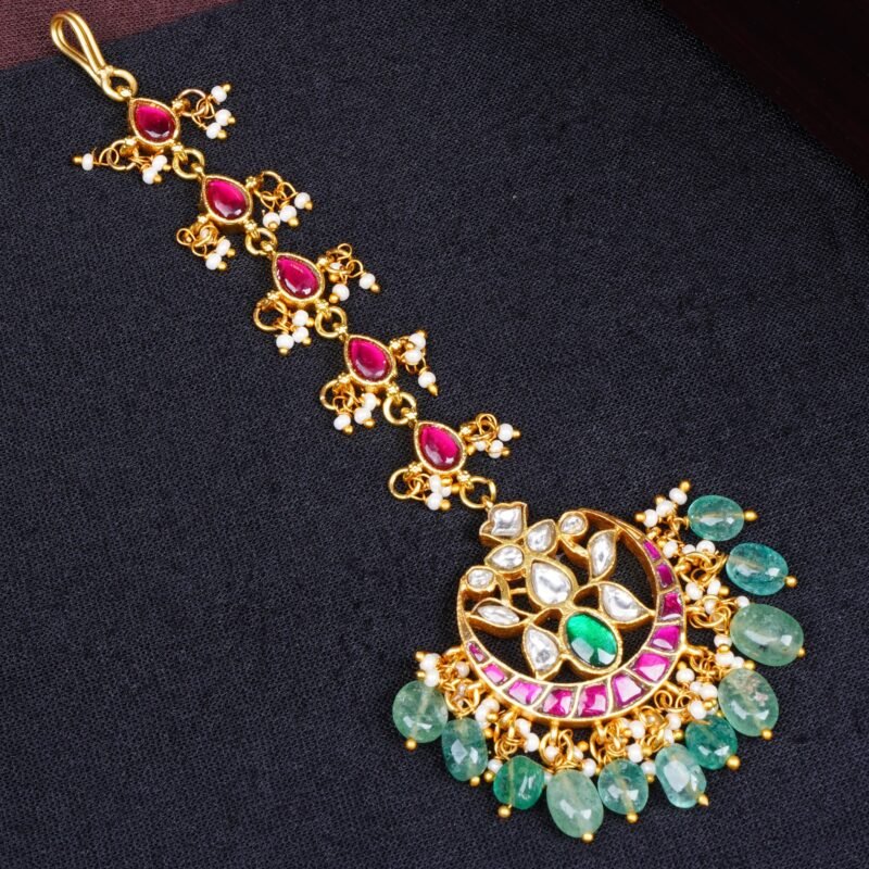 Jadau Kundan Long Tikka with Emerald Bead Drops