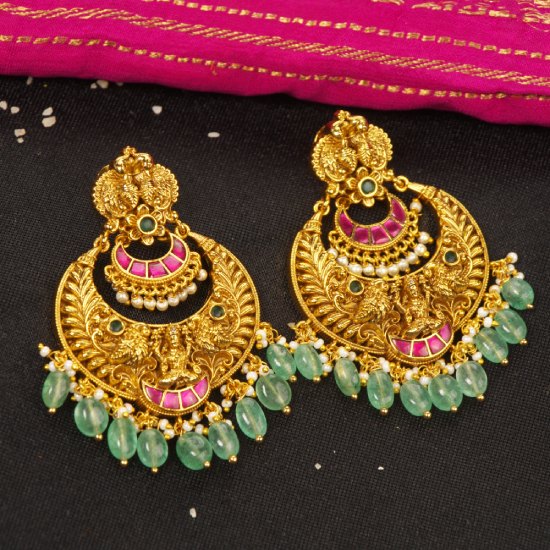 Embrace the grandeur of tradition with these Antique Gold Temple Chandbali Earrings, inspired by classic South Indian temple jewelry. These earrings feature intricate goddess motifs, accented with ruby-pink enamel and green bead drops that add a regal touch. Perfect for weddings, festive occasions, and cultural events, these handcrafted earrings beautifully capture divine elegance and timeless artistry.